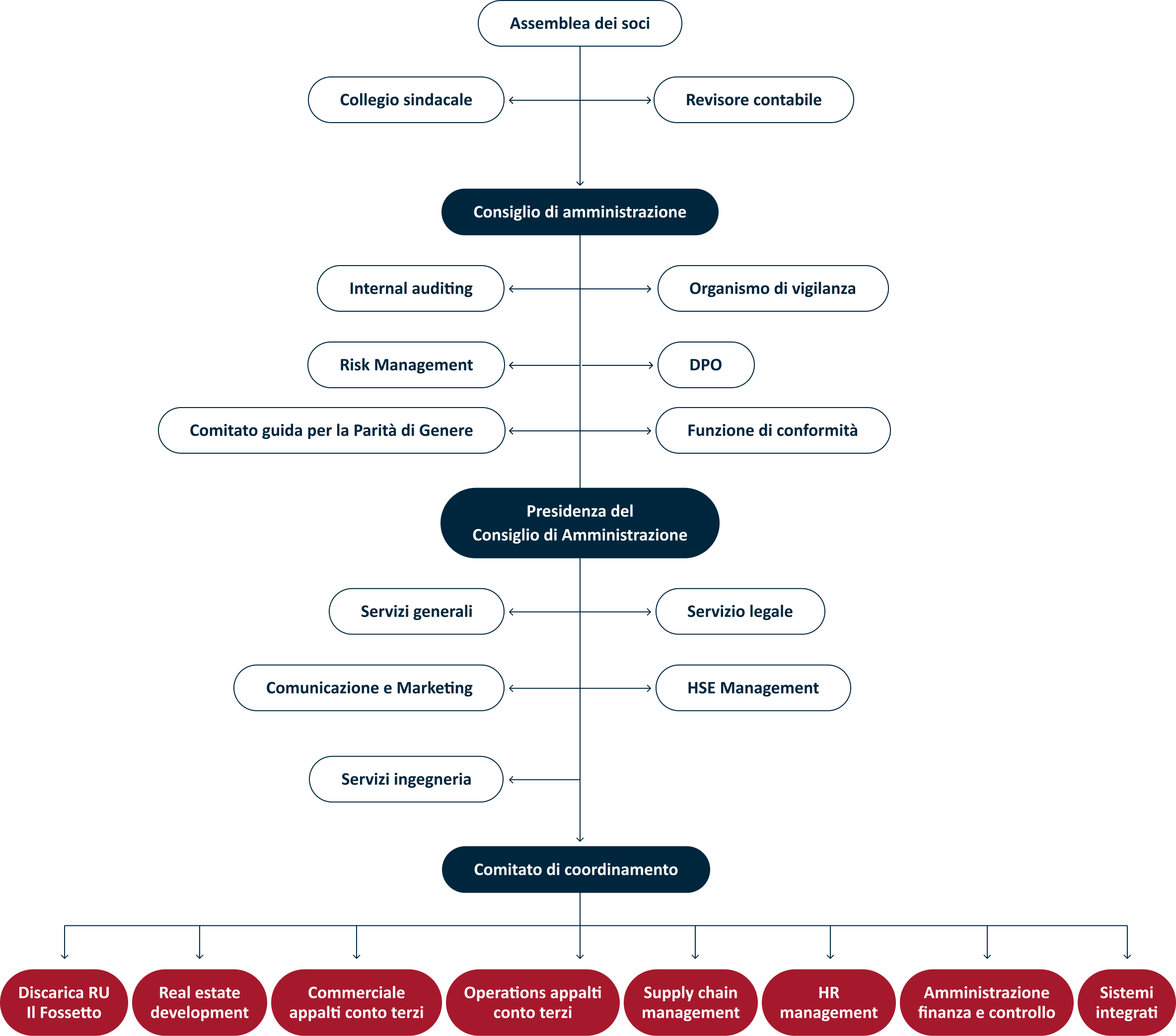 Il Consiglio di amministrazione e il Presidente svolgono una funzione di definizione delle linee guida strategiche della società. Le Direzioni di settore (Real Estate Development, Commerciale Appalti conto Terzi, Operations Appalti conto Terzi, Supply Chain Management, HR Management, Amministrazione Finanza e Controllo, Sistemi Integrati, Impianto del Fossetto), svolgono una funzione esecutiva, supportata dal Comitato di Coordinamento.